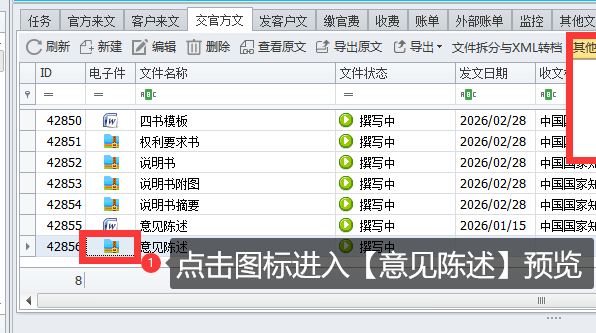 【功能价值】:优化后的CPC撰写导出的ZIP文件,拖拽到案件工作台-发官方文列表中,可以直接通过电子申请工具进行二次编辑,丰富案件的请求书内容。极大的方便机构律所的流程人员快速进行交接制作。